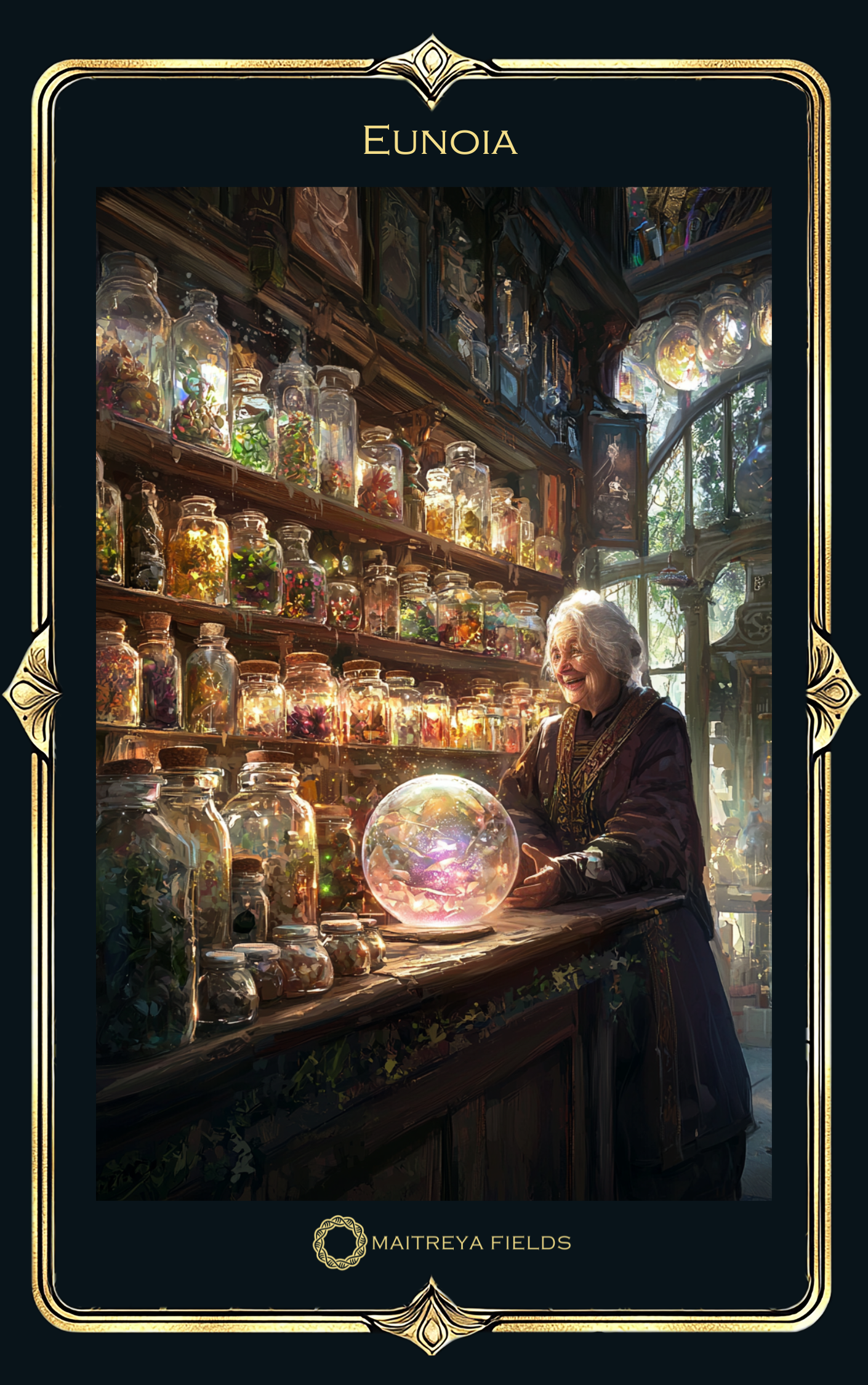 The sign above the door reads "Eunoia" in elegant, gilded script. Drawn by curiosity, you step inside. The shop is a mosaic of sights and scents: shelves lined with glass jars of vibrant herbs, crystals that shimmer like captured stars, and candles flickering softly, casting dancing shadows on the walls.